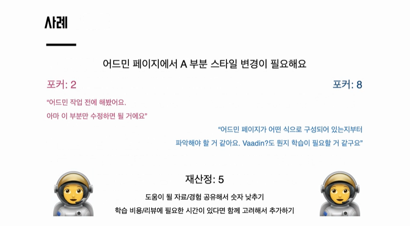 - 플래닝 포커 5 = 5일 (일주일 근로 최대. 10시간)