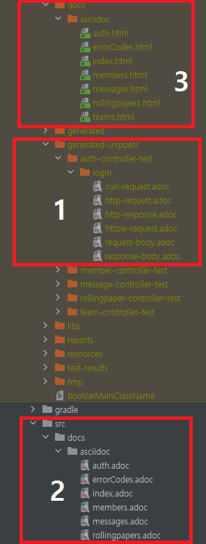 - gradle의 스니펫은 build/generated-snippets에 생성된다. 스니펫 생성 디렉토리를 snippetsDir라는 전역변수에 담는다.