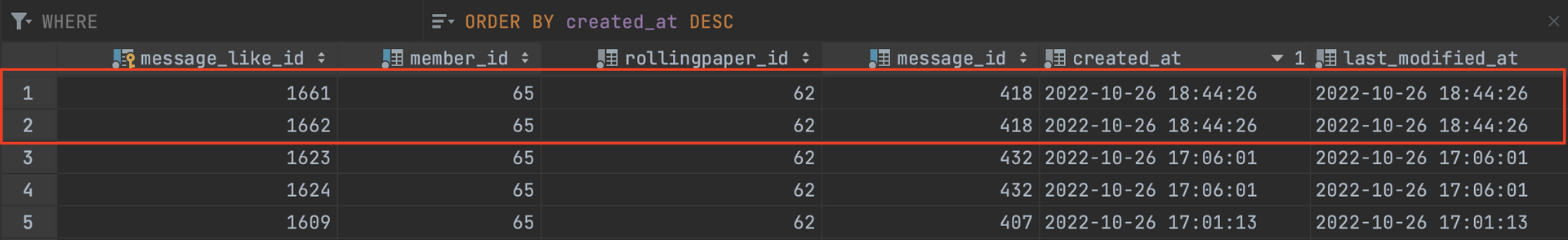 | 3 | 메세지 좋아요 기록 존재하지 않는가? true | |