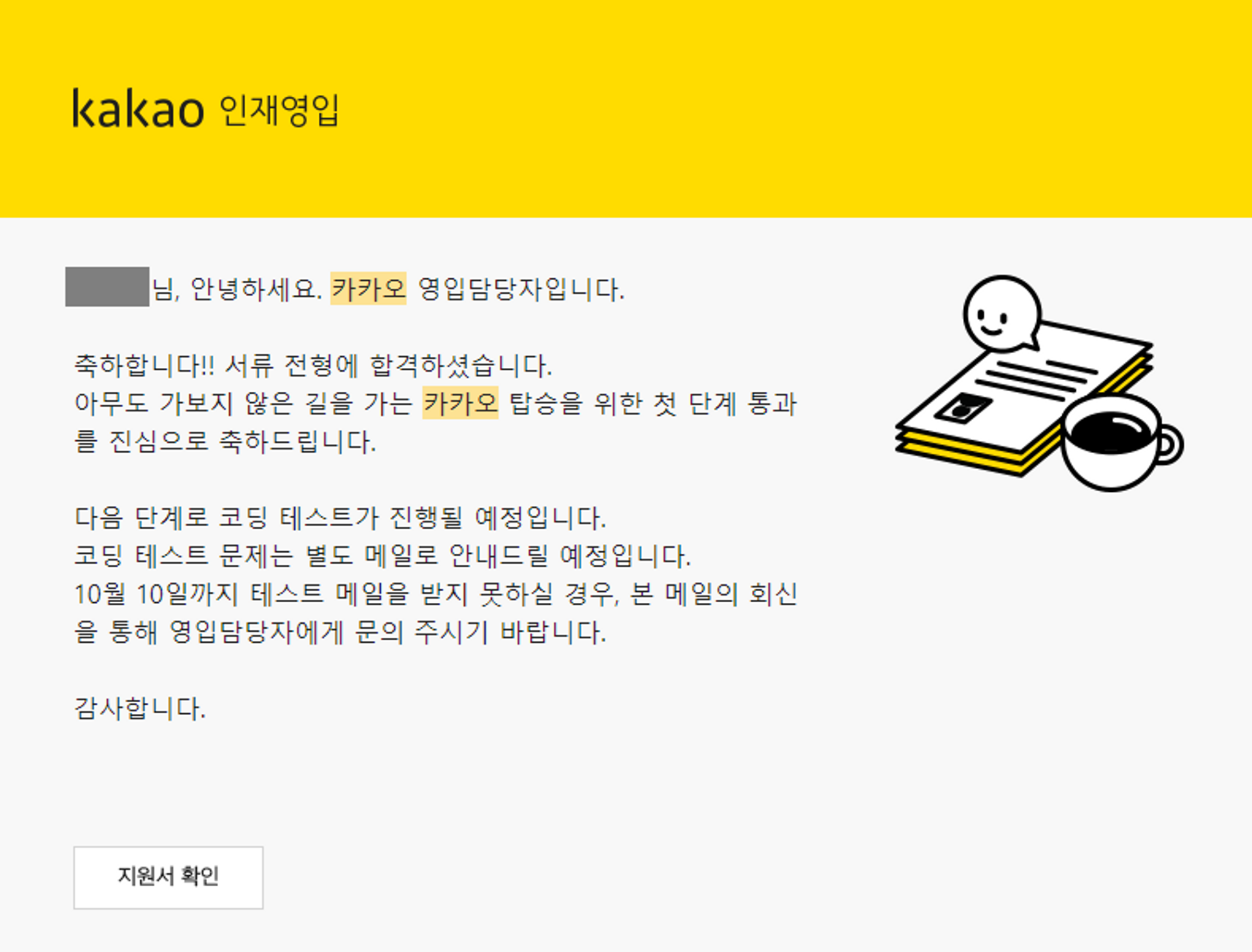 코딩테스트 합격은 2일 뒤 메일을 받을 수 있었습니다.
